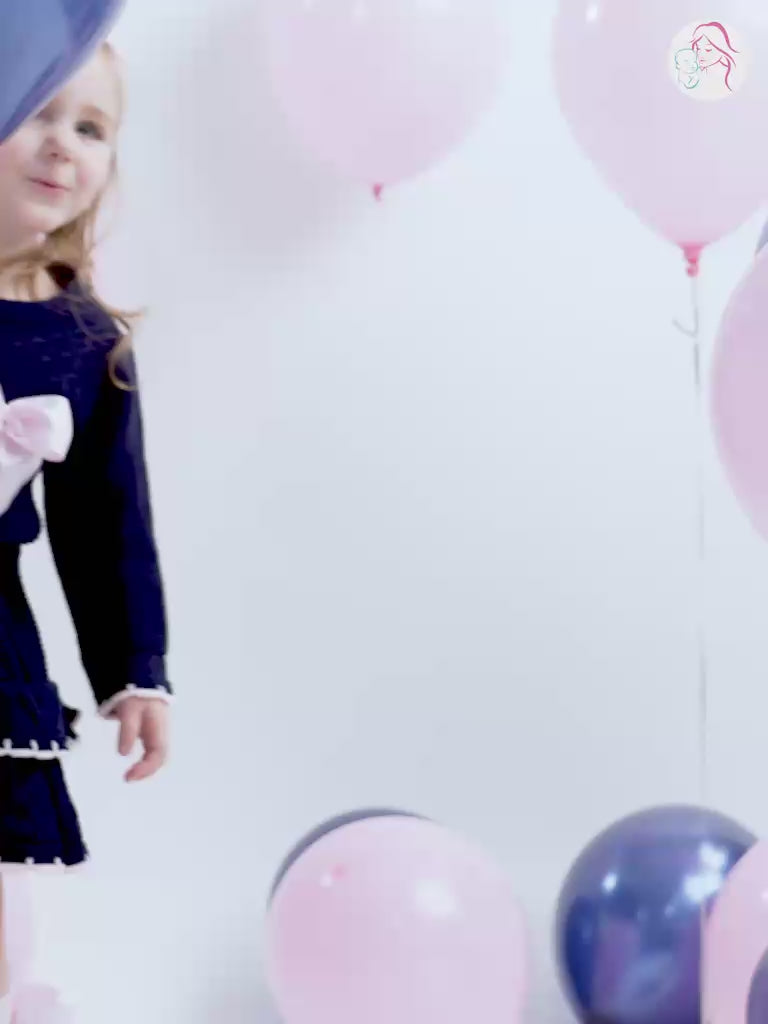 Dress your baby girl in style with our Baby Girl Adelina Collection 2-piece Spanish Knitted Set. This adorable set includes a navy long sleeve top with a baby pink satin bow and a knee-length skirt with two ruffles and contrasting curvy hem.