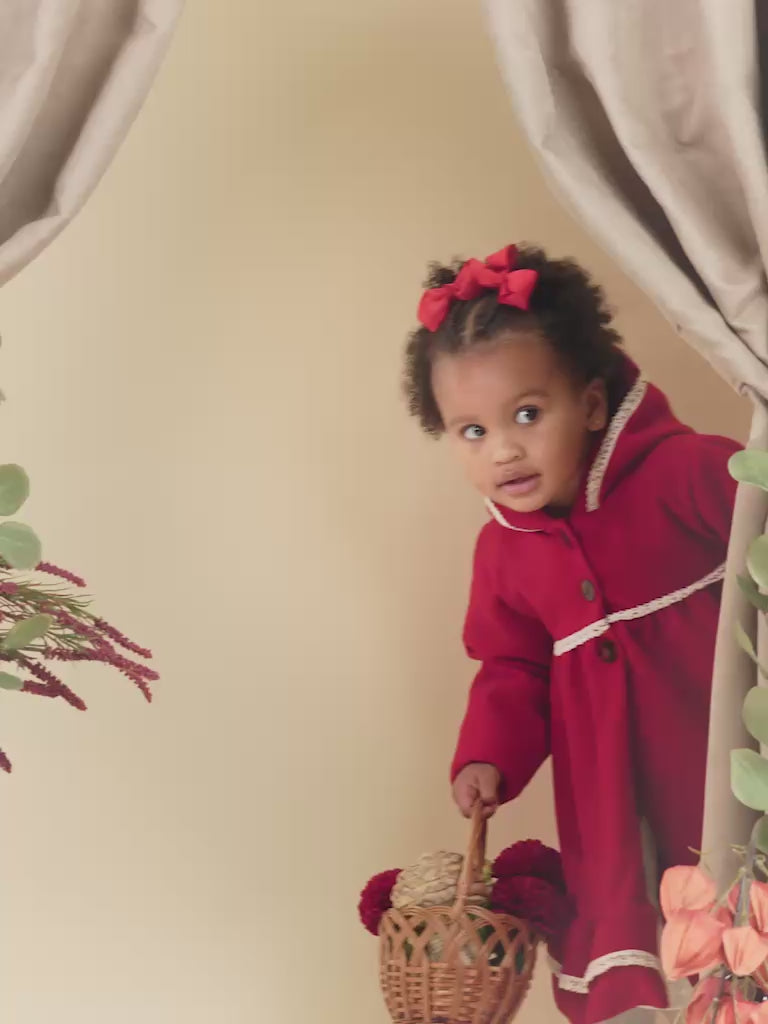 Dress your little one in timeless elegance! This beautiful coat features a charming, flared Spanish design for a sweet silhouette. It's finished with delicate lace trim along the hood and hem and fastens with adorable, contrasting round buttons. Perfect for special occasions or adding a touch of classic style to any outing.
