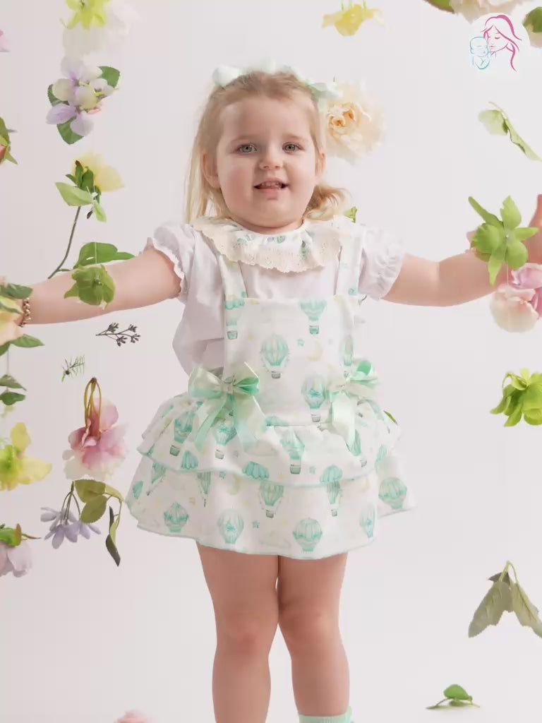 Delight your little one with our Baby Girl Josefina 2-piece Spanish romper set. This charming set includes two pieces: a romper with straps and two ruffles that give it a dress-like appearance, along with a short-sleeve shirt featuring a frilly collar that matches the romper and detailed with a crochet trim. The romper is adorned with a playful Mint air balloon and cloud print, has an elasticated waist, and comes with adorable two-tone bows. This outfit is both comfortable and stylish!