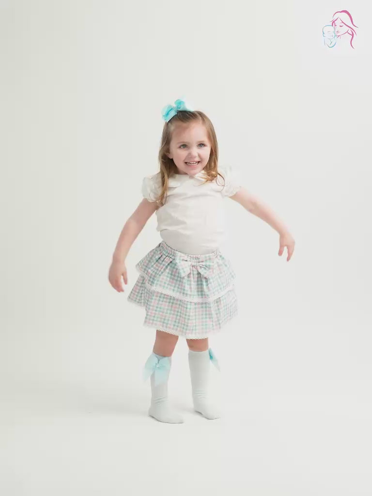 Dress your little one in the elegance of our Baby Girl Spanish Checked Romper collection, which comes in a variety of charming colors including blue, pink, and orange. This delightful outfit perfectly blends style and comfort. It features a pristine white top embellished with intricate lace detailing along the Peter Pan-style collar, and short puff sleeves add a touch of whimsy and charm. The bottoms are designed with two layers of ruffles that create a skirt-like appearance. The ruffles are trimmed with lace at the hem to match the top, and they are crafted from soft, breathable cotton with a playful checkered print. A large bow sits gracefully at the front of the waist, adding a flourish of femininity to the ensemble. Made from 100% cotton, this 2-piece romper set is ideal for hot summer days.