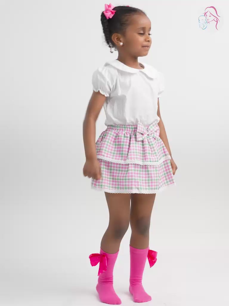 Dress your little one in the elegance of our Baby Girl Spanish Checked Romper collection, which comes in a variety of charming colors including blue, pink, and orange. This delightful outfit perfectly blends style and comfort. It features a pristine white top embellished with intricate lace detailing along the Peter Pan-style collar, and short puff sleeves add a touch of whimsy and charm. The bottoms are designed with two layers of ruffles that create a skirt-like appearance. The ruffles are trimmed with lace at the hem to match the top, and they are crafted from soft, breathable cotton with a playful checkered print. A large bow sits gracefully at the front of the waist, adding a flourish of femininity to the ensemble. Made from 100% cotton, this 2-piece romper set is ideal for hot summer days.
