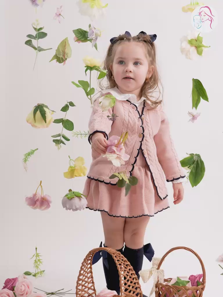 Dress your little girl up in our Baby Girl Viviana 3-piece Knitted Set! This set includes a knitted cardigan with a charming cable knit pattern, a matching romper with a ruffled dress-like design, and a white, soft cotton, long-sleeved shirt with a cute peter pan collar. With Navy ribbed detailing and button closures, this set is both stylish and practical. Your baby girl will be cosy, fashionable, and comfortable all at once!